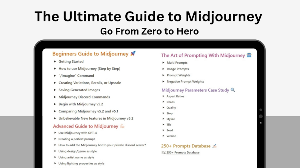 "The Ultimate Guide to Midjourney" covers essential topics, including Getting Started, Image Generation, Image Editing, Image Sharing, and Image Automation.
